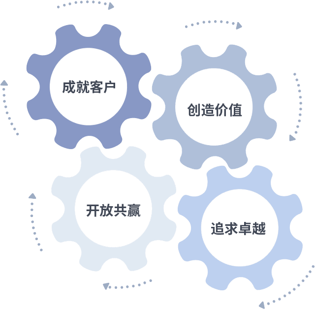 成就客户是一切决策的出发点,,,创造价值是衡量所有工作的标准,,追求卓越是我们做事做人的态度,,,,开放共赢是我们的格局也是最终的结果。。价值观的齿轮环环相扣,,,,推动着组织里的每个人不断向前。。。。