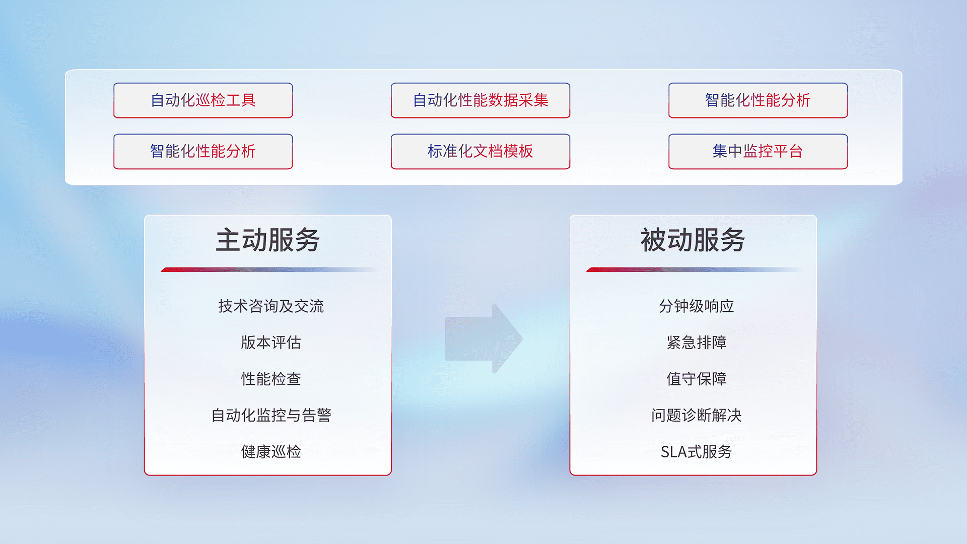 智能化工具和标准化文档,,,,保障服务质量,,,提供主动服务(包含技术咨询、、版本评估、、性能检查、、、、自动化监控与告警、、、健康巡检)和被动服务包含(分钟级响应、、紧急排障、、、、值守保障、、、、问题诊断解决、、、SLA服务)。。。。